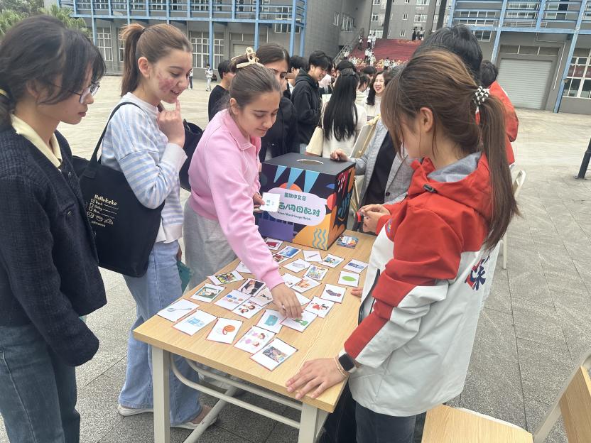 “诗图、词图配对”环节兼具知识性与审美性。本次活动精选“床前明月光”“大漠孤烟直”等经典诗词,搭配对应意境的画作或实景图,中外学生分组匹配并用中文朗诵解说。泰国留学生王楚月在配对“春风又绿江南岸”时,结合家乡春景分享感悟,让在场师生感受到诗词的跨文化感染力。