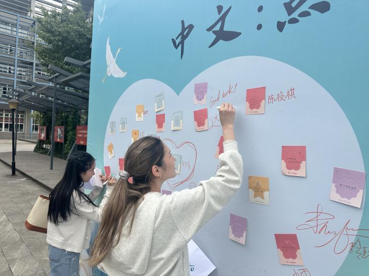 中文心愿卡DIY区域同样吸引众多参与者。师生们手持彩纸、画笔、贴纸,用中文写下心愿与祝福:中亚留学生达娜写下“愿中文水平越来越高”,中国学生李刚则写下“愿中外友谊像长城一样长久”。大家还将剪纸、绘画元素融入设计,制作出独一无二的心愿卡,现场组成“心愿墙”,成为跨文化祝福的集中展示。